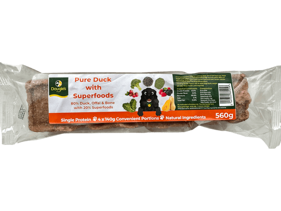 60% Duck, 10% Duck Bone, 10% Duck Offal, 20% Superfoods (incl Healthy Veg, Seaweed, Chia Seeds, Kale Powder, Spirulina) Complimentary Feed for Working Dogs