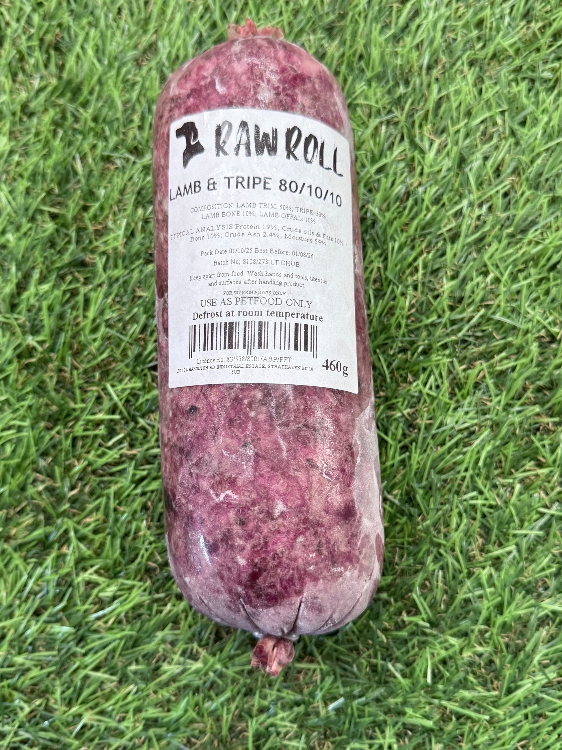 Raw Rolls Lamb Tripe Complete 80/10/10 Chubb delivers a balanced, nutritious meal combining premium lamb meat, fat, and tripe in an 80/10/10 ratio. This chubb provides essential nutrients and enzymes that promote healthy digestion, muscle strength, and overall well-being. Its convenient shape makes portioning simple, offering a fresh and natural raw feeding experience your pet will love.